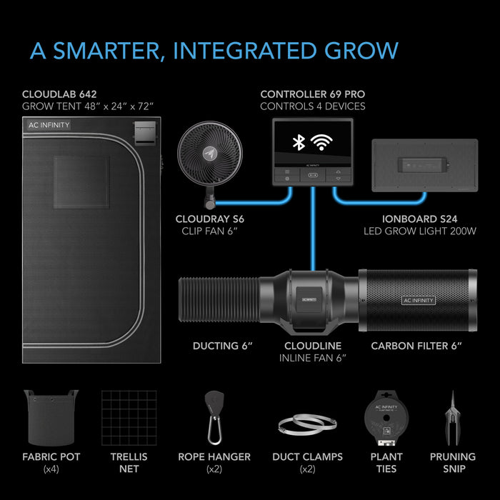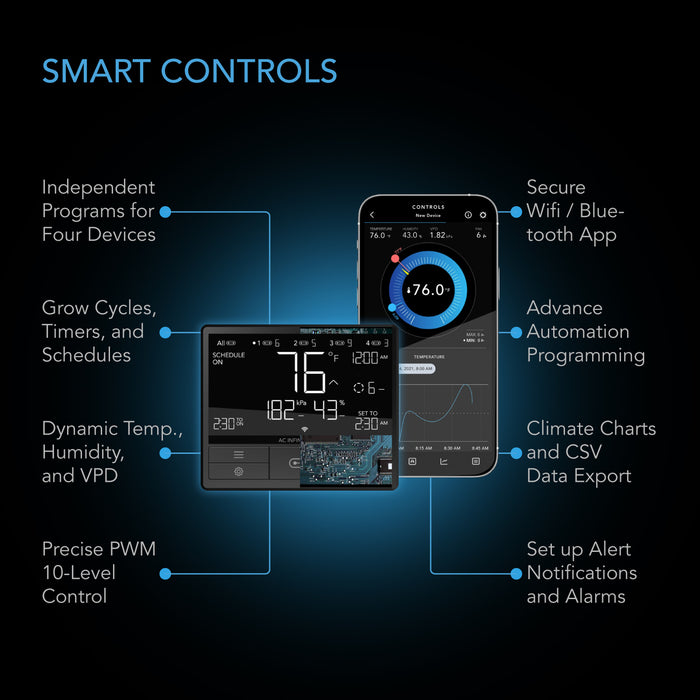 Integrating these components is the CONTROLLER 69 PRO, engineered to provide each device with shared or independent programming. This central control unit can set dynamic programs to activate your grow devices in response to VPD (vapor pressure deficit) levels, in addition to temperature and humidity, to help you further dial into your ideal growing space. Timer, cycle, and schedule modes add custom on-demand activation for a variety of indoor growing uses. Securely connect to the AC Infinity app via WiFi to remotely access your indoor grow system from anywhere outside the boundaries of your home, unlocking advance programs, alerts, notifications, and historical charts.