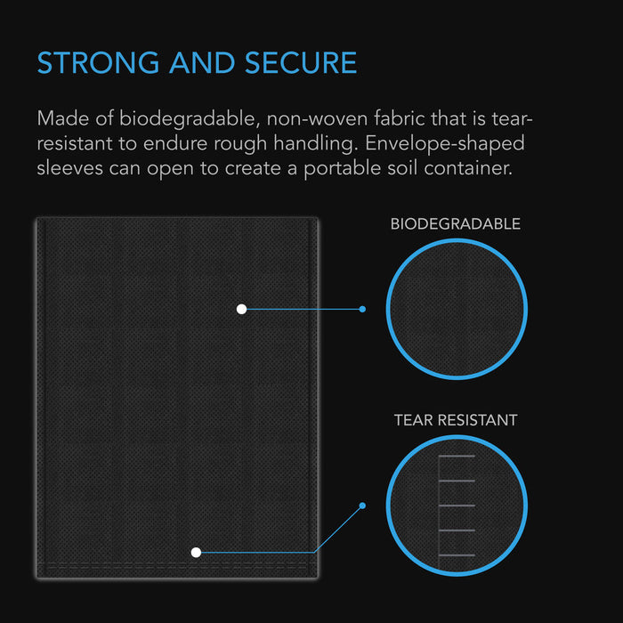 A pack of nursery bags designed for germination applications like seed starting and clone propagation to promote healthier root structures. Each durable fabric root pouch is tear-resistant to withstand rough handling and is biodegradable, decomposing over various time periods based on environmental conditions. Its permeability allows for your plant’s roots to penetrate and for moisture to pass through to prevent overwatering. In addition, the black appearance insulates the soil while protecting your seedlings from harsh sunlight. The nursery bag’s durable build strengthens its capacity to hold soil while reducing the impact of transplant shock and improving your plant’s survival rate. Comes packaged envelope-style that opens to create a portable grow bag soil container.