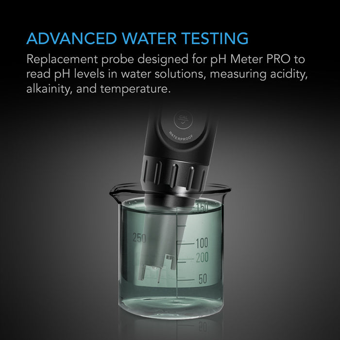 A replacement probe specially made for the AC Infinity pH Meter PRO to detect pH levels, measuring acidity and basicity in water solutions. Using this probe will increase your savings by eliminating the need to purchase brand-new pH meters. It features a lithium glass membrane that instantly detects water acidity, alkalinity, and temperature and helps determine pH readings with precise ±0.01 accuracy. This glass membrane sensor is covered by a shield to protect it from impact and ensure the replacement probe’s longevity. Installation is hassle-free, creating a seamless seal that keeps the probe in place and water from leaking through.