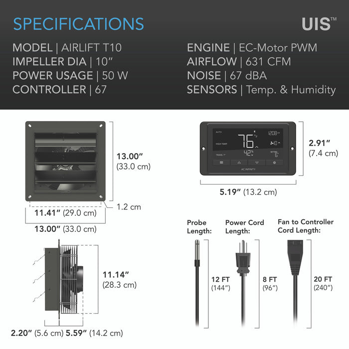 A high-airflow exhaust fan designed to cool and ventilate greenhouses, garages, attics, workshops, and sheds. The system can automatically eliminate heat, moisture, odor, and dust from enclosures, rooms, and buildings. Includes a smart controller with dynamic climate and time-based programming and can connect to multiple UIS devices. Innovative EC motor with PWM control maximizes airflow while reducing energy consumption and noise levels. Heavy-duty build features aluminum blades, steel wire guards, and steel shutters. This product is a part of the UIS™ platform of grow devices and smart controllers, designed to integrate with each other to achieve your ideal environment.