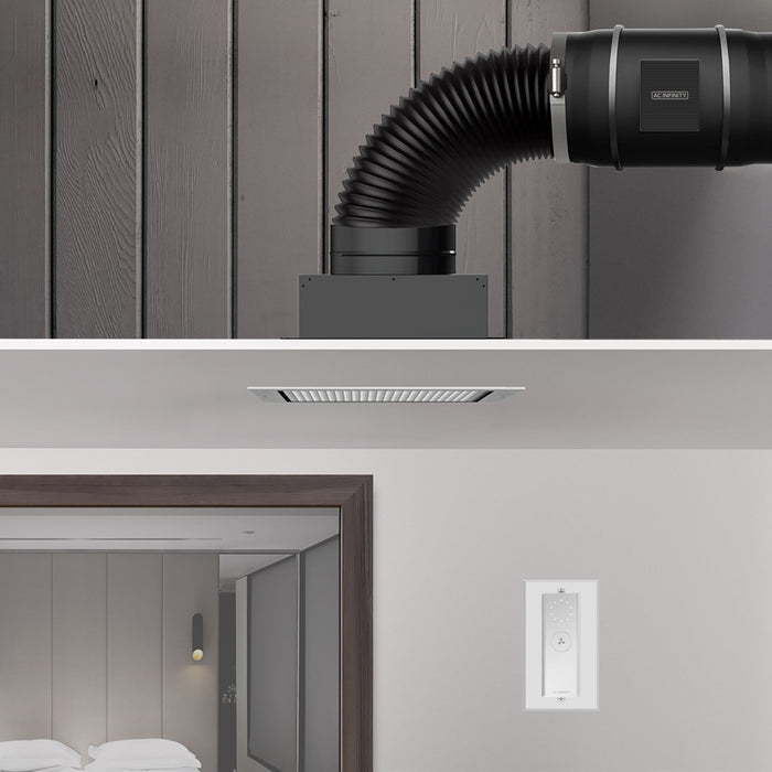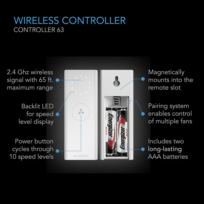 10-speed wireless controller with backup memory remotely adjusts fan speed and optimizes airflow.