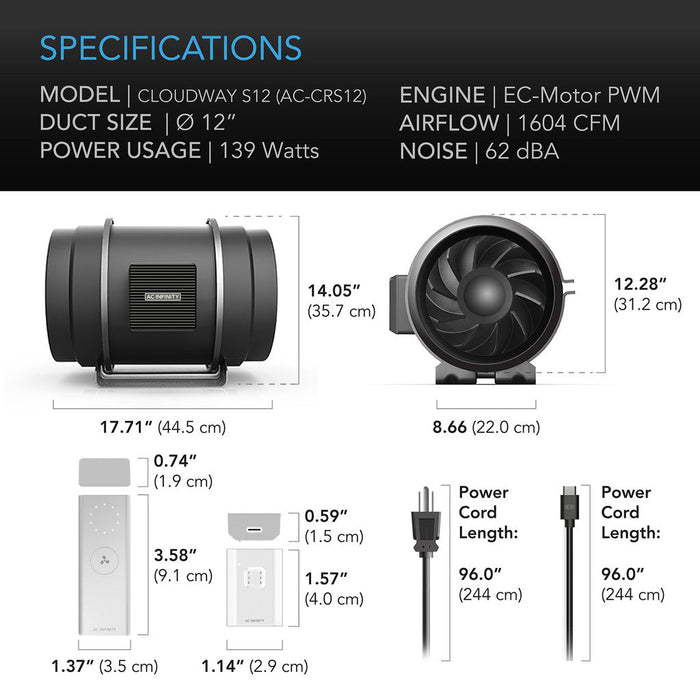 Duct Size: 12” | Dimensions: 12.3 x 17.7 x 14.1 in. | Airflow: 1604 CFM | Noise: 62 dBA | Bearings: Dual Ball