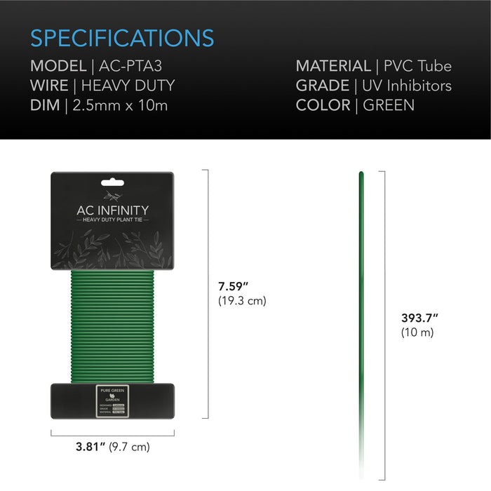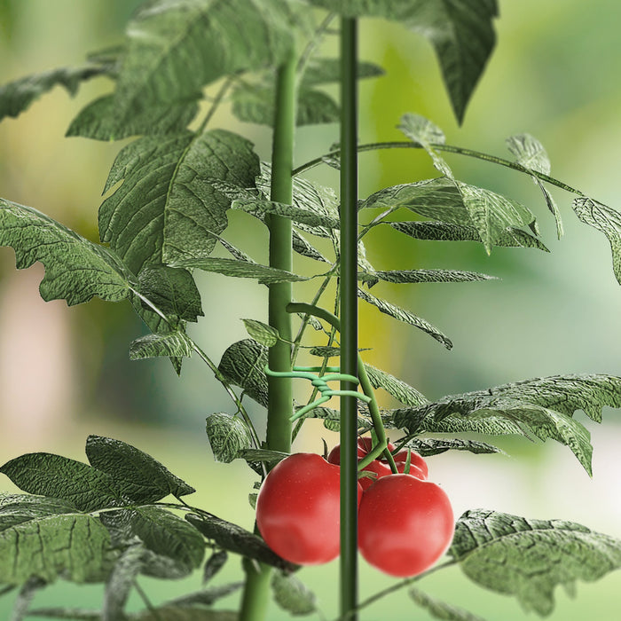 A set of heavy-duty wire fasteners designed to hold plants up together with stakes, grids, posts, and other support systems. Each bundle of green plant ties is made of an iron string core enveloped in a dense, heavy-duty PE plastic that is easy to shape. The rubberized texture ensures that each twist will not come undone and stay wrapped around your plant. In addition, its non-abrasive surface provides cushioned support and handling while not cutting into your plant’s stems. The garden wire ties wrap around the packaging, which allows convenient hanging, for easy unwinding and cutting to your desired length.