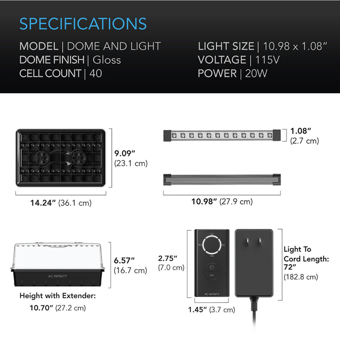 This humidity dome serves as the ideal well-regulated environment for growing seedlings and cloning a wide variety of plants including spices and aromatics. Its compact and durable design can easily fit on balconies, window ledges, in your grow tent, or in any room in your home. Quickly and easily transport the domed seedling tray as needed thanks to its practical size. With relocatable light bars that can be intensified and used as supplemental lighting, they can also be set in grow tents to help create a controlled, resource-efficient environment throughout your plant's grow cycle. Pair this kit with the SUNCORE Series of seedling heat mats to further improve germination success.