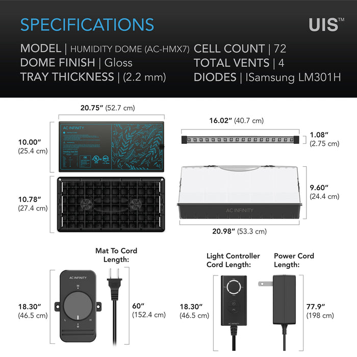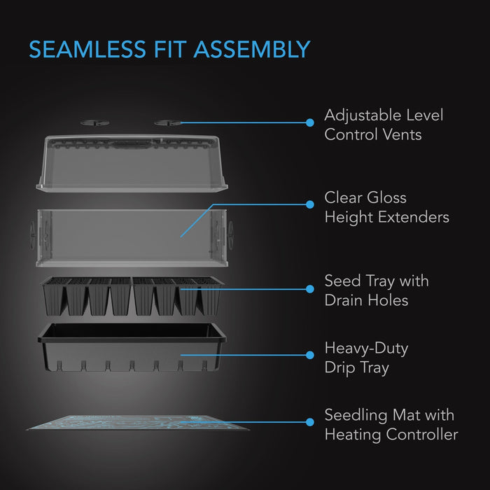 A domed germination kit designed to promote successful plant growth and propagation by producing a high-humidity environment. Included within the kit are the humidity dome, grow light bars, and the seedling mat. The transparent dome allows for optimal light saturation while offering easy observation of your plants’ progress. Adjustable vents on the dome offer complete humidity control through smooth and effortless rotation. Make further adjustments with the optional height extender, which can be applied to elevate the dome for cloning projects. The drip and seedling trays fit seamlessly to support up to 40 seedlings while catching excess water and preventing leaks in the process.
