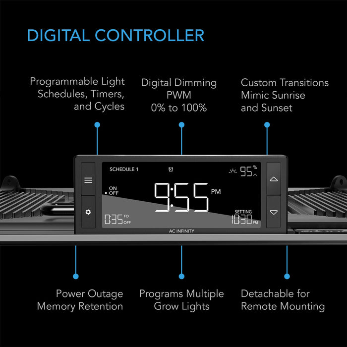Each system includes a programmable controller that is capable of efficient 0-100% PWM dimming. Set timers and consistent light cycles up to 24 hours for both on and off. Features baseline brightness levels and backup memory in case of a temporary power loss. Controllers can be detached to be mounted remotely and are built with extension ports to provide programming to additional LED grow lights.