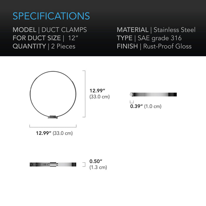 This duct clamp is designed to secure various ducting components together. It features a heavy-duty stainless steel (SAE grade 316) construction with a worm drive lock. In addition, our clamps must pass a strict quality control process to ensure securing and tightening is smooth, the worm-drive will not get stuck, and will not slip after installation. Dual type screw-head enables both Phillips or flat-head screwdrivers for adjusting the clamps. Each clamp is coated with a rustproof and corrosion-resistant gloss finish. Two clamps are included in each pack.