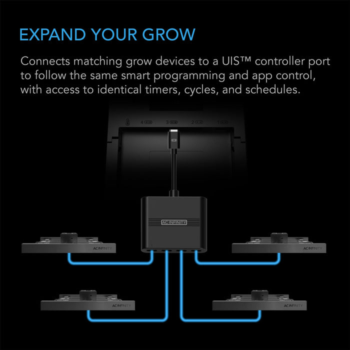 A 4-port splitter hub designed to split UIS controller programming to multiple same-type grow devices. With this connector, you can expand your grow setup and distribute programming from one port to all linked devices. Connect up to 3 tiers of growing equipment like EC motor fans, environmental humidifiers, LED lighting fixtures, and more with additional splitters and hubs. The hub’s highly durable build is engineered with premium cables to ensure a firm connection with UIS ports and connectors. Compatible with AC Infinity controllers like CONTROLLER 69, CONTROLLER 69 PRO, CONTROLLER 69 PRO+, and future UIS controllers. Not compatible with RJ11/12 Type-A and Type-B adapters.