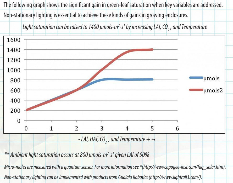 LightRail®moves your indoor grow lights over the tops of the plants, reducing shadow patterns and reducing heat, getting those grow lights closer for maximum use of available wattage and PAR (Inverse Square Law), and getting the correct intensity of light on all the leaves for optimum Leaf Area Index (LAI) which is the single most important factor in increasing yield.