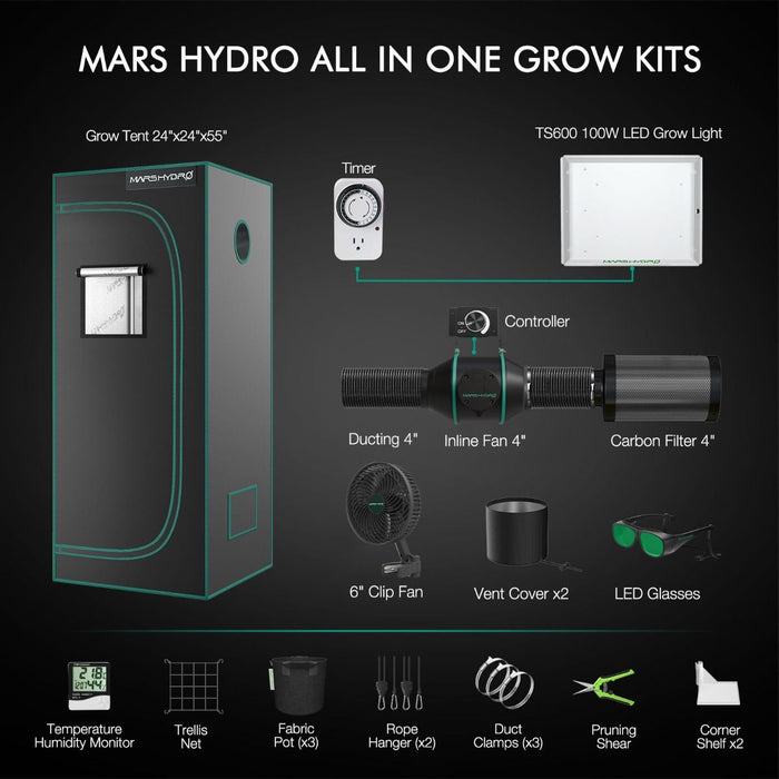 Mars Hydro TS600 + 2'x2' Complete Grow Tent Kit + 4” iFresh Full Fan Kit