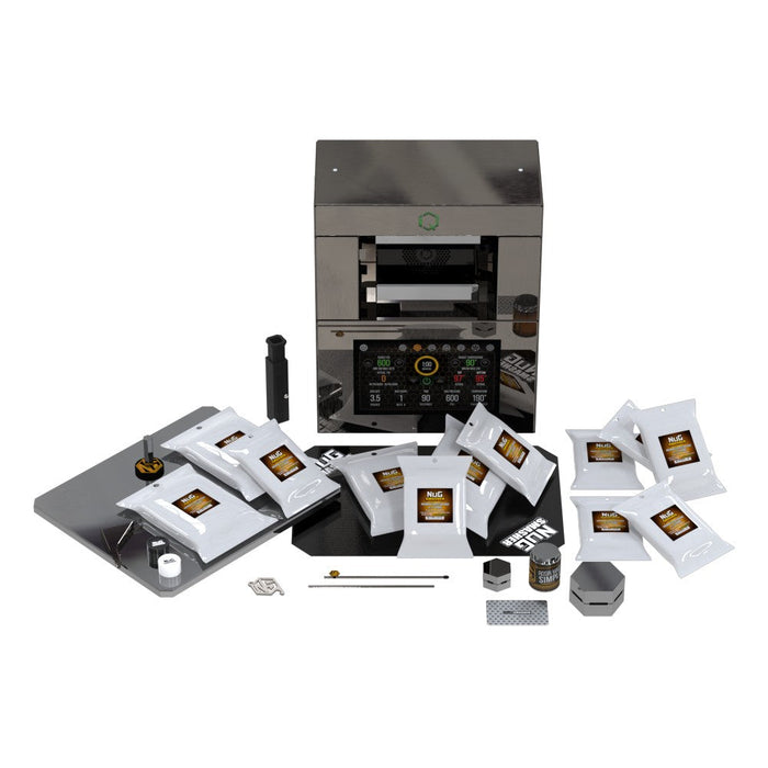 The NugSmasher® IQ Rosin Extraction System Essentials Combo Package Deal covers the Essentials and will get you started making your own solventless Rosin The Essentials Combo includes: (2) Nugsmasher Magnets, Eleven (11) Packs of twelve (12) premium extraction bags all microns, 3.5g Pre Press mold, Silicon Mat,Rosin Press collection plate,the Everything Tool, NugPacker Jr and the Rosin POT.