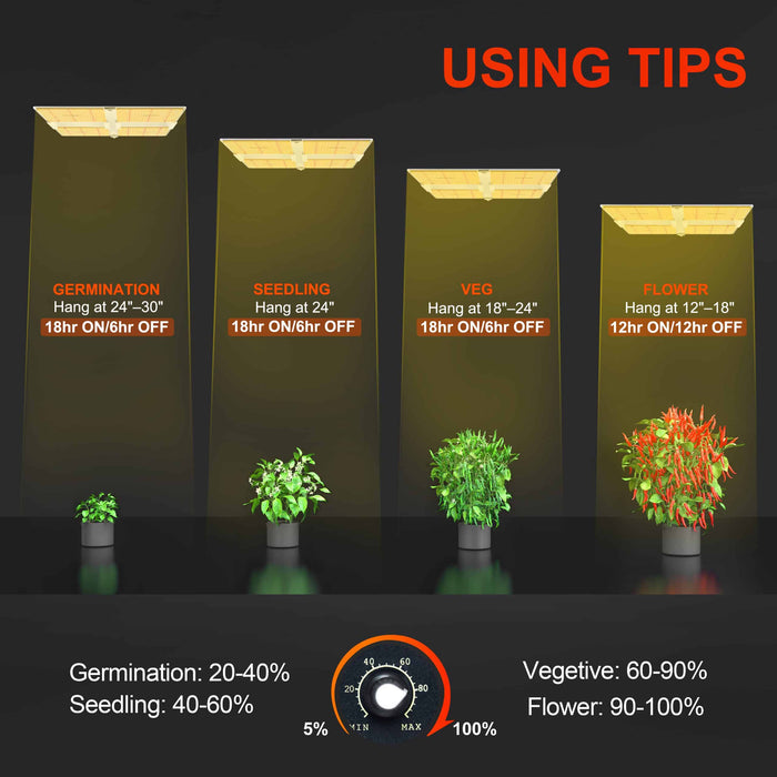 • Full Spectrum & Uniform Photon: SF7000 led full spectrum grow light (2800-3000K,4800-5000k, 650-665nm) is designed with both vegetative and flowering growth periods in mind. With an upgraded design to make PPFD more uniform, the value between the edge area and the center area is reduced. The large fixtures with diodes spread out over the entire surface ensure a more even coverage and deeper penetration.