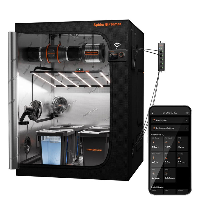 Easily manage your grow setup with the Spider Farmer app, available on the Apple Store and Google Play. With just a one-time setup, you can automate lights, fans, and watering—perfect for beginners or busy growers. The included GGS Controller and GGS AC5 Smart Power Strip work together to automate all your devices.