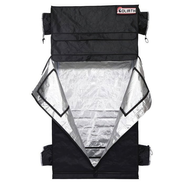 Professionally designed Goliath Grow Tents are ideal for experts and beginners alike. Expert configuration puts ducting ports in their ideal locations. Large Easy-View windows offer progress view access without compromising your growing environment. and the doorways offer 360 degree access. The large configuration provides obstruction free maneuvering. Maintaining an ideal growing space is a breeze with its thick material and large double cinching duct ports.